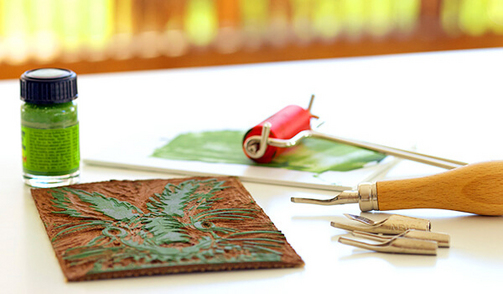 Zwischendrin habe ich einen Andruck gemacht, um zu wissen, was ich noch wegschneiden muss. Für den Andruck habe ich nur wenig Farbe genommen und auf die Farbplatte gewalzt. Der dünne Farbfilm wird mit der Walze auf die Linoleumplatte übertragen. Danach wird die eingefärbte Platte gegen das Papier gedrückt. Man kann dazu einen Suppenlöffel nehmen und mit kreisenden Bewegungen die Platte abreiben; dann das Papier vorsichtig anheben. So habe ich gesehen, dass ich noch einige Linien vergessen hatte nachzuziehen. Da ich meinen Hasen auch freistehend ohne Hintergrund haben wollte, musste ich diesen auch noch wegschneiden. Mit dem großen Hohleisen bekommt man den Hintergrund schnell abgetragen. Wenn das geschafft ist, kann man einen zweiten Andruck machen und nochmal überprüfen, ob das Ergebnis passt oder ob nochmal korrigiert werden muss. Für den letzten Druck ein bisschen mehr Farbe nehmen. Ich habe ganz normale Acrylfarbe genommen, davon habe ich eine große Auswahl zuhause.